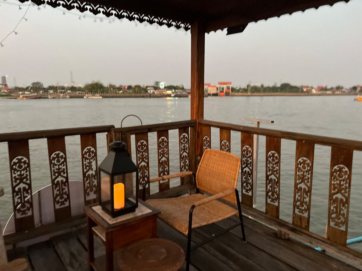 Ngôi nhà gỗ cổ bên bờ sông Chao Phraya trên đảo Ko Kret. Không khí bên bờ sông thoải mái và yên tĩnh vì đây là một ngôi nhà đơn lẻ, rất riêng tư. Bạn chỉ có thể đến đây bằng đường thủy. Vào buổi tối, bạn sẽ thấy hàng trăm con chim hạc bay quanh nhà và thường bay lên ngoài mái hiên. Bạn có thể chèo thuyền trên sông, chơi nước hoặc đi dạo trong vườn, đi bộ khám phá Ko Kret.