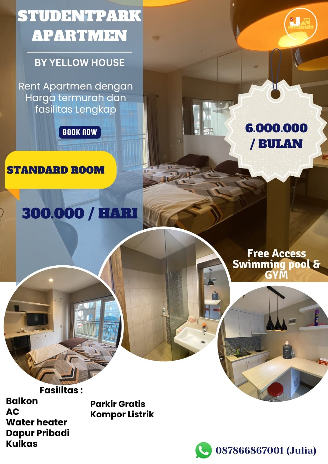 Căn hộ sạch sẽ, thoải mái và giá rẻ Cho thuê Căn hộ Student Castle Seturan Tower A 5 phút đến UGM & UNY 3 phút đến UPN, Atma Jaya & YKPN 2 phút đến Ambarrukmo Plaza Các điểm ẩm thực và giải trí ở Jogja Tiện nghi: Giường Wifi 10 Mbps ở phòng Tủ bàn Tủ lạnh Bình xả nước Bếp Máy nước nóng an ninh 24 giờ Chỗ đỗ xe Bể bơi Phòng tập thể dục Hãy liên hệ với chúng tôi với mức giá đặc biệt vào giữa tuần Tiền thuê theo ngày, theo tuần, theo tháng và theo năm Để biết thêm thông tin, vui lòng liên hệ với tôi qua AirBnb