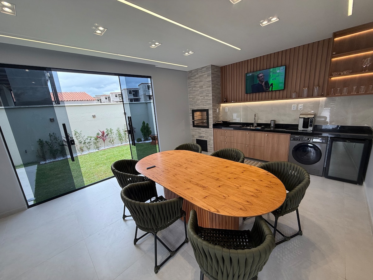 Casa Completa, Moderna e Perfeita para Relaxar em Amigos e Família! A casa conta com 3 quartos espaçosos e confortáveis, sendo: - 2 Quartos com Cama Queen - 1 Quarto com 2 Camas de Solteiro - Todos os Quartos com TV e Netflix - Sala climatizada com TV Na Área de Lazer no Quintal, você encontra um paisagismo com ambiente climatizado integrado com churrasqueira e mesa de jantar, trazendo um clima tranquilo e agradável para sua estadia, ideal para reunir família e amigos.