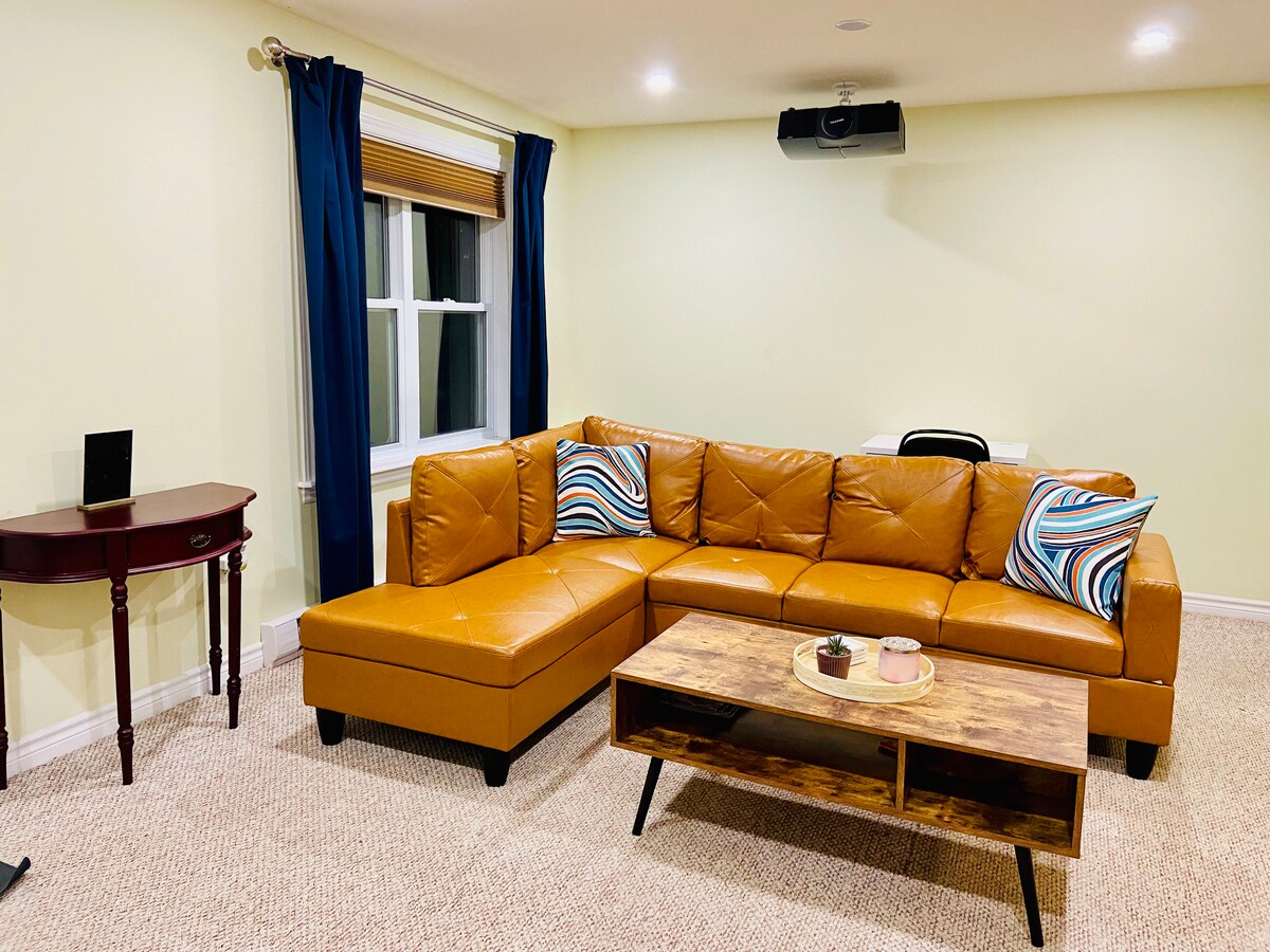 Phòng khách tầng hầm riêng sáng sủa và ấm cúng!