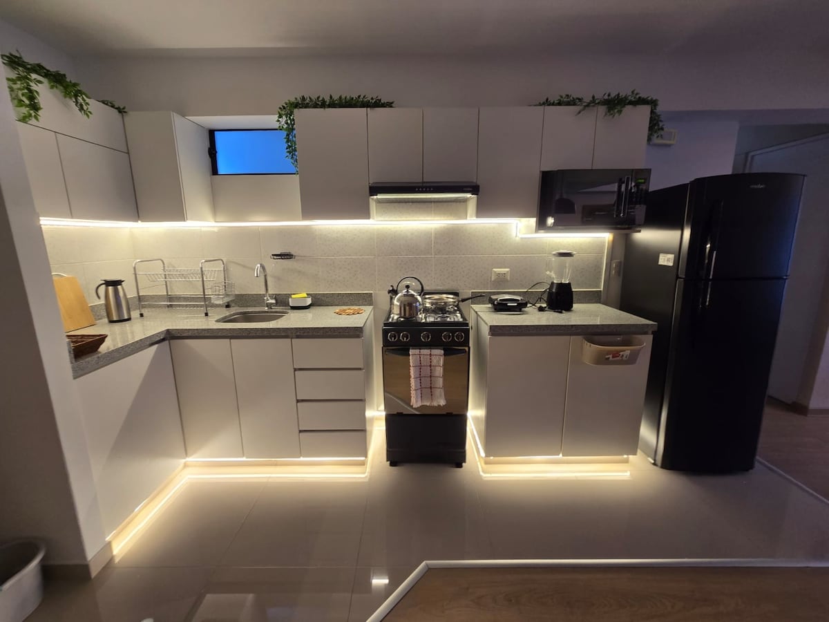 Modern fully furnished apartment, ideal for long stays. Features high-speed Wi-Fi, a 65” Smart TV with Netflix and Disney+, a fully equipped kitchen with espresso machine and water filter, washer-dryer, Double bed, and a balcony. The building offers a swimming pool, gym, and coworking area. 24/7 self check-in, smartkey, free parking, and 24-hour security. Strategically located in San Miguel, close to universities and shopping centers, and less than 20 minutes from the airport.