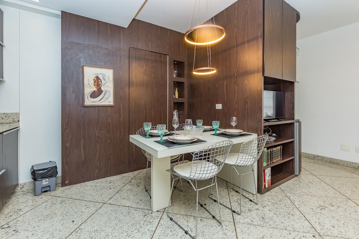 Căn hộ hiện đại, 32 m2, nằm ở điểm tốt nhất của Sion. Thực hành nhà bếp với minibar, bếp nấu, TV (kênh mở/Netflix), điều hòa, máy sấy tóc, ấm đun nước điện và internet. South Zone, cạnh Quảng trường JK và Đại lộ Bandeirantes, đối diện với một Siêu thị. Tầng thượng của tòa nhà có phòng tập thể dục, phòng xông hơi khô, hồ bơi, khu vực sinh hoạt và bếp cộng đồng (nước, máy làm đá). Có dịch vụ vệ sinh theo yêu cầu. Tòa nhà an toàn với nhân viên hỗ trợ 24 giờ. *Không bao gồm gara.