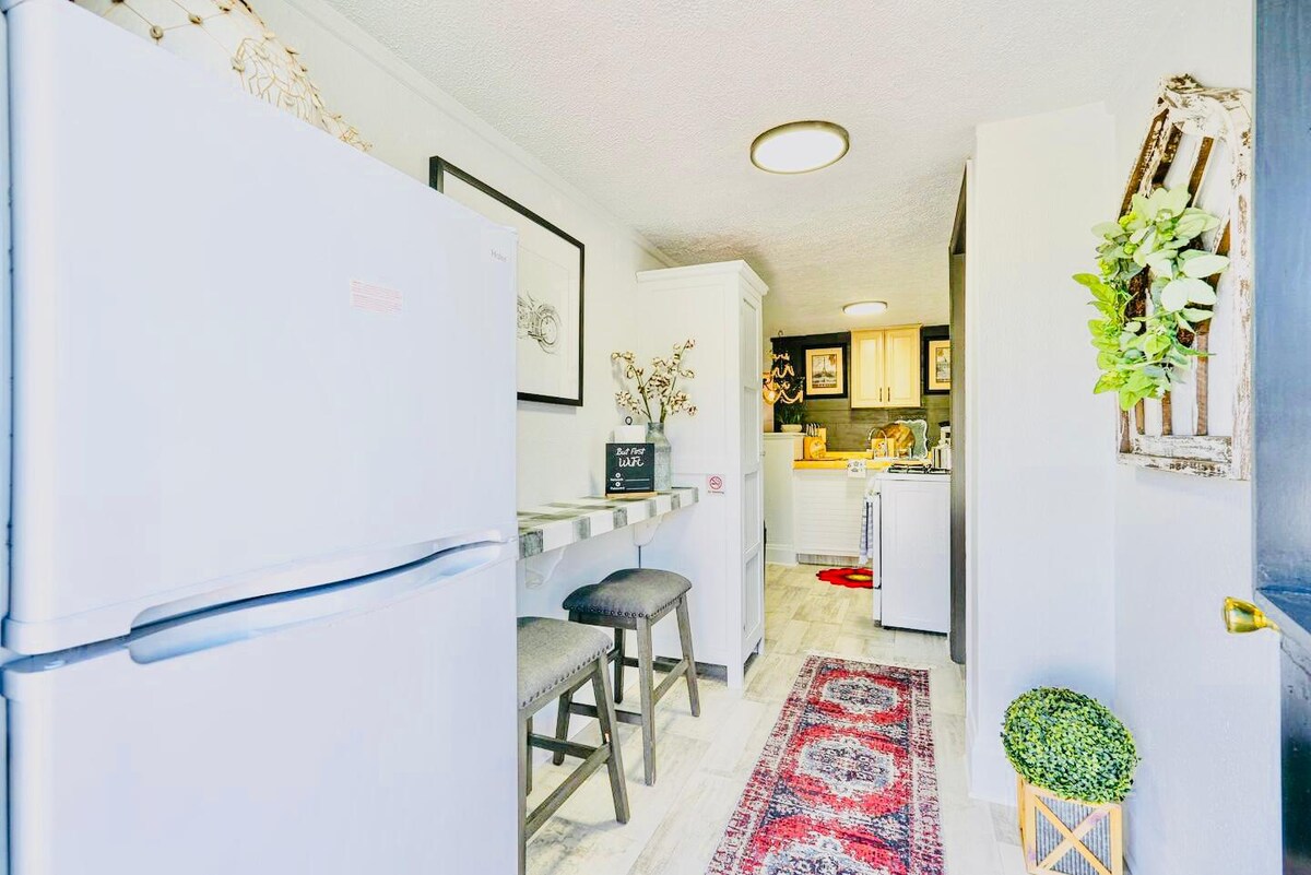 Studio rộng 500 ft vuông, lối sống khái niệm mở. Bếp có bếp và tủ lạnh cỡ căn hộ, lò vi sóng, máy nướng bánh mì và Keurig. Phòng tắm có vòi sen lớn, không có bồn tắm. Khu vực ngủ có giường cỡ king. Không gian được thiết kế dễ dàng và thoải mái. Nó gắn liền với nhà tôi nhưng với cuộc sống độc lập. Chỗ đỗ xe có sẵn dưới nhà để xe hoặc bên cạnh nhà. Nằm cách Marietta 5 phút với lối đi dễ dàng. Bàn phím điện tử. Vui lòng ghé thăm Roadrunner 's Haven.