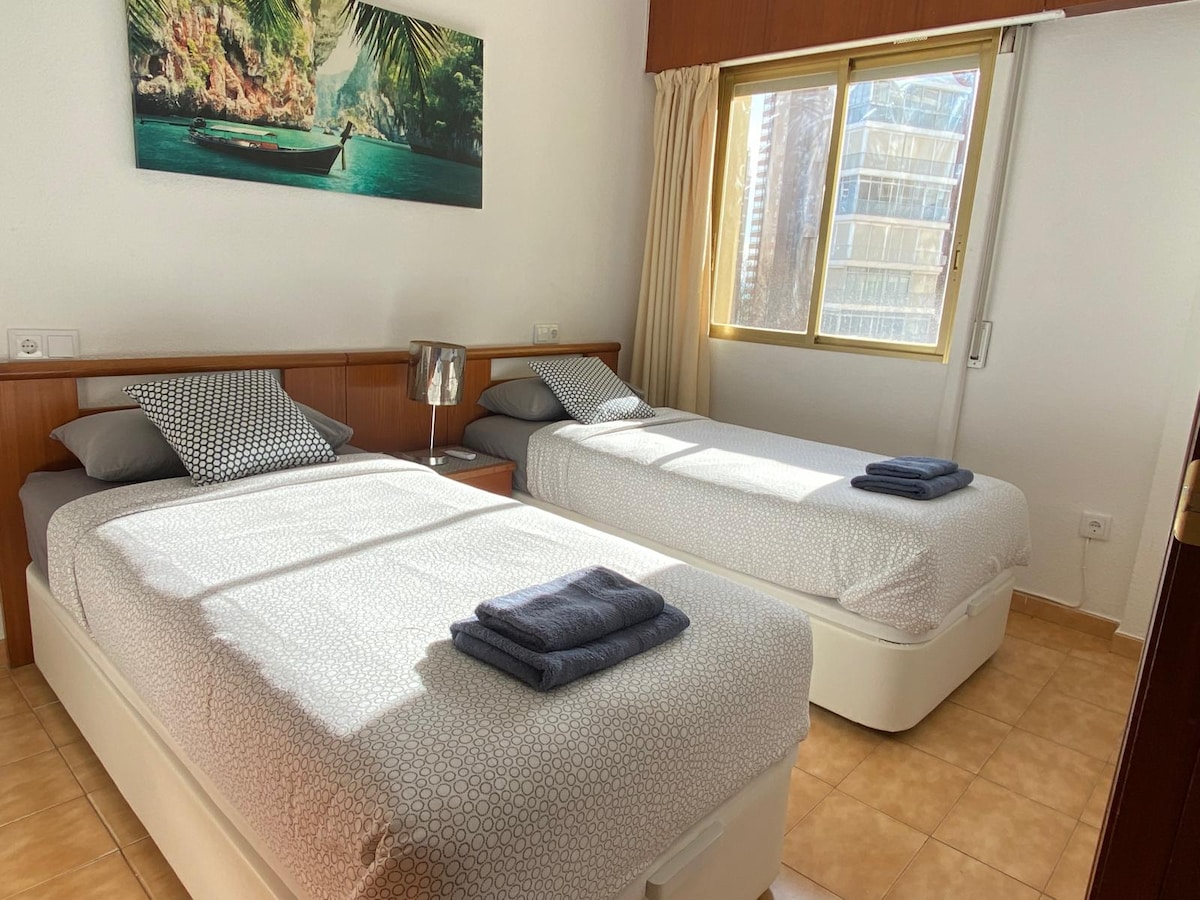 Căn hộ đẹp ở Benidorm. Cho thuê nhà nghỉ dưỡng một phòng ngủ. Rất trung tâm, cách phía tây và bãi biển Levante khoảng 200 m. Gần lâu đài, quảng trường tam giác, vinitos và công viên Elche. Tầng 1 có thang máy Vài người hàng xóm và yên tĩnh. Nó có máy bơm nóng lạnh, phòng khách với giường sofa, nhà bếp và phòng tắm. Có thể đỗ xe cách khoản thanh toán bổ sung vài mét và quên đi chiếc xe, bởi vì bạn có tất cả các dịch vụ đi bộ để biết toàn bộ trung tâm lịch sử và trung tâm thành phố.