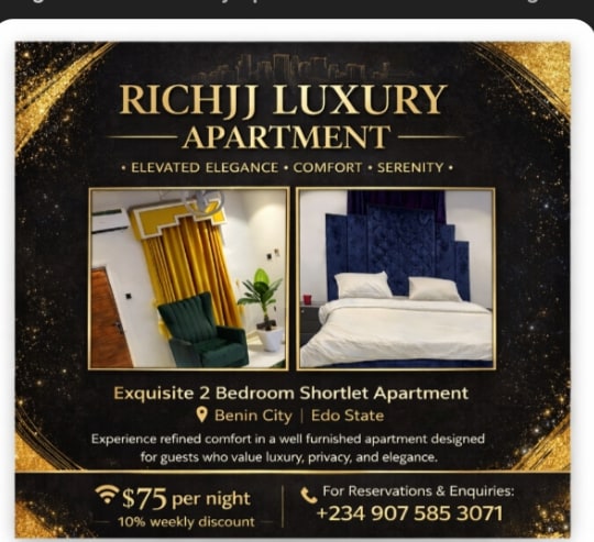 Đây là một căn hộ 1 phòng ngủ được trang bị nội thất đẹp ở GRA Benin City, cách sân bay 10 phút lái xe với đường dễ đi đến các trung tâm mua sắm khác nhau và trung tâm giải trí xung quanh trục GRA. Đặc điểm nổi bật Điều hòa nhiệt độ đầy đủ Nhà bếp trang bị hiện đại Phòng khách rộng rãi Ánh sáng tự nhiên Phòng tắm khép kín Trang trí hiện đại An ninh 24/7 Chỗ đỗ xe an toàn Số kênh Dstv Internet Dọn phòng Bể bơi