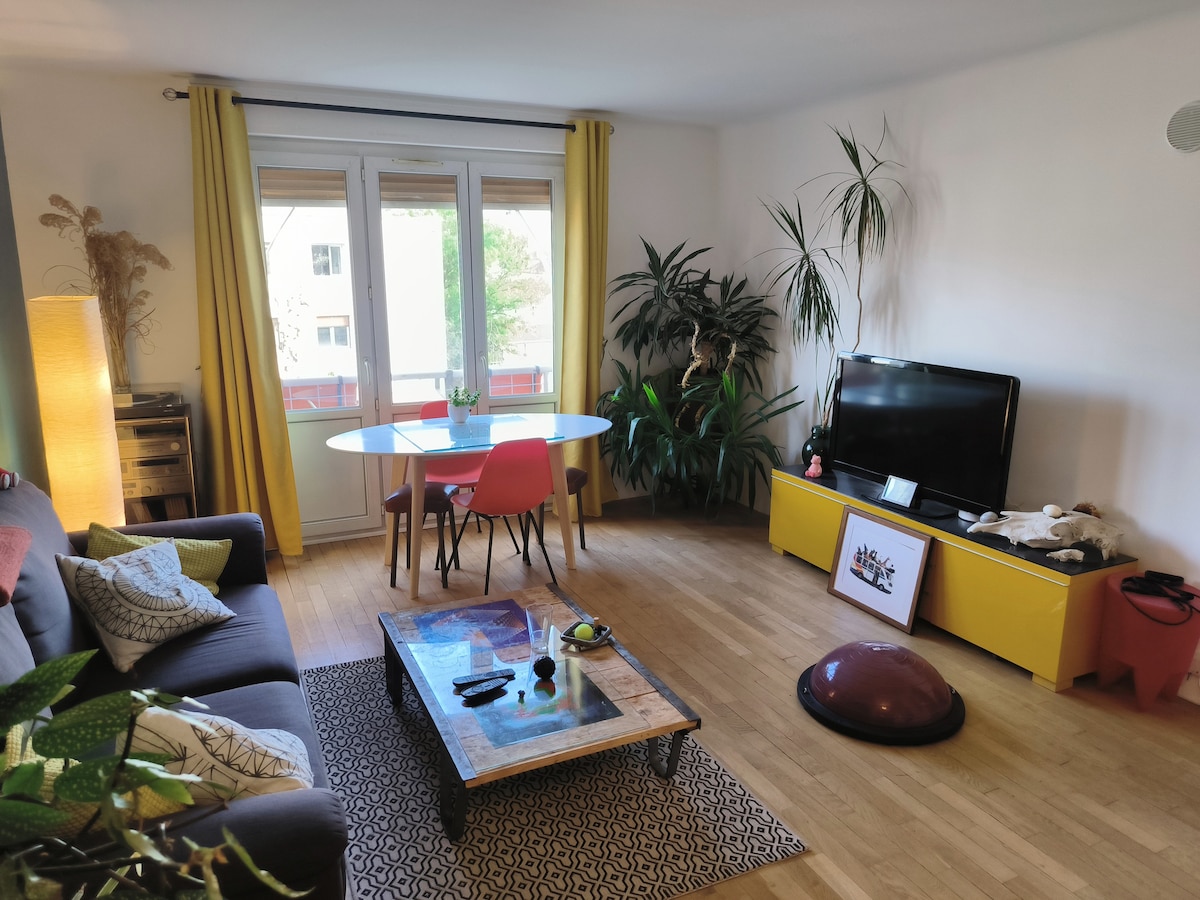 🌿 Détendez-vous dans ce logement calme et élégant. 60m2 de confort dans un décor bohème chic en rez-de-jardin avec terrasse et parking privés. 🌼 🌳Dans un cadre verdoyant et cosy, loin de l'agitation du centre-ville mais assez proche (15 mm) vous pourrez bénéficier des avantages de notre belle ville de Nancy. 🏰 Ce logement lumineux de plain-pied, tout équipé a une vue directe sur le jardin arboré ⚘️ et la terrasse aménagée. ☀️ Posez vos bagages et profitez ! Carpe Diem ! 😊