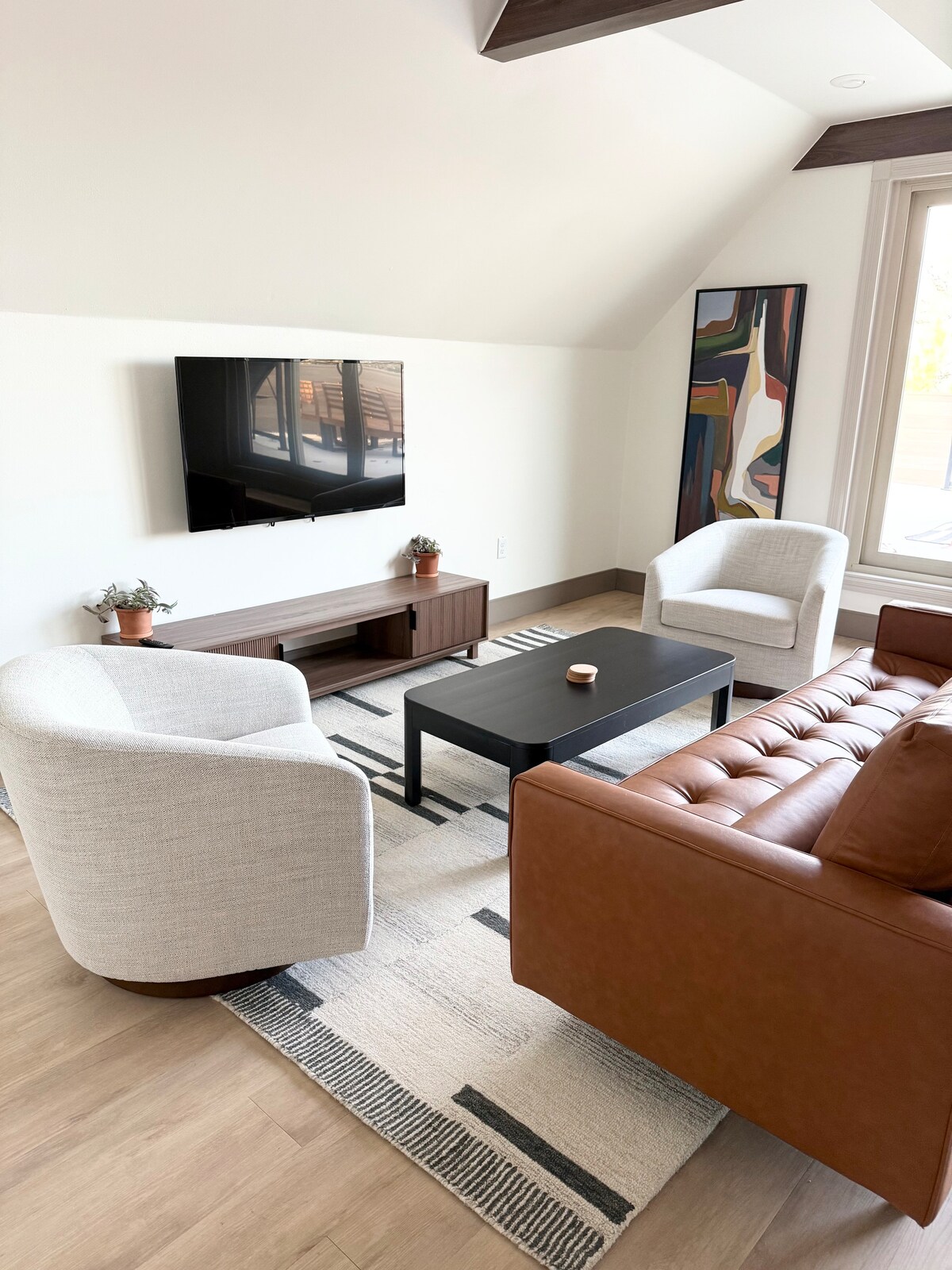 Phòng King Suite của chúng tôi có tầm nhìn ra hồ ĐẸP NHẤT tại chỗ ở. Người ta có thể nhìn thấy hàng dặm đến bờ đối diện, được bao quanh bởi địa hình đồi núi. Nó có lối trang trí hiện đại giữa thế kỷ, bao gồm nghệ thuật treo tường theo chủ đề âm nhạc, một cây đàn guitar Fender Stratocaster và Spark amp cho những người có khuynh hướng như vậy. Ấm cúng lên đến TV thông minh 50”với hệ thống âm thanh Klipsch và lò sưởi điện cho bầu không khí quanh năm. TV trực tiếp, Internet tốc độ cao và thư viện DVD rộng lớn đảm bảo bạn sẽ không bao giờ cảm thấy buồn chán. Phòng này có nhà bếp đầy đủ.