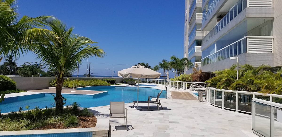 ** Datas abertas para o Reveillon, Natal e férias de janeiro. Pacotes com Desconto, valores melhores e condições especiais! Entre em contato.** Apto moderno e confortável com churrasqueira, varanda gourmet com Fechamento em Vidro e vista parcial para o mar. Situado ao lado da entrada da praia, no módulo 7, possui Serviço de Praia diário, Wi-Fi rápido, Piscina Aquecida, 1 suíte master com cama queen, e 1 quarto amplo com 4 camas de solteiro. O apto possui Ar Condicionado em todos os ambientes.