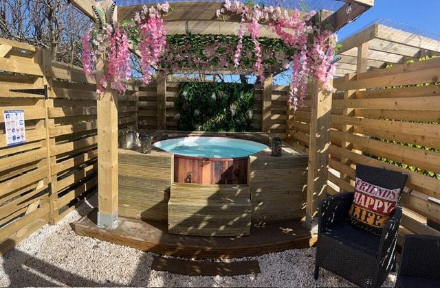 Căn hộ có bồn tắm nước nóng và khu vườn để tận hưởng.