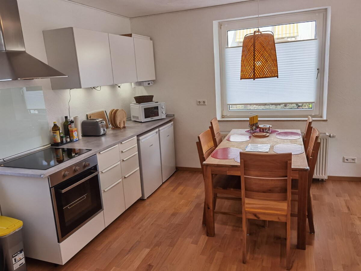 Căn hộ đầy nắng gần trung tâm thành phố với sân thượng trong khu dân cư yên tĩnh và ưa thích với chỗ đỗ xe miễn phí. Căn hộ nghỉ dưỡng mới được cải tạo có thể chứa tối đa 6 khách một cách thoải mái với hai phòng có thể ngủ. Căn hộ có bếp đầy đủ tiện nghi. Phù hợp cho kỳ nghỉ, người đi bộ đường dài, chỗ ở cho khách, người tham gia hội thảo, thợ lắp ráp và thợ thủ công. Cũng có thể làm việc: Internet nhanh với mạng LAN/WLAN, có thể in. Chào mừng bạn!