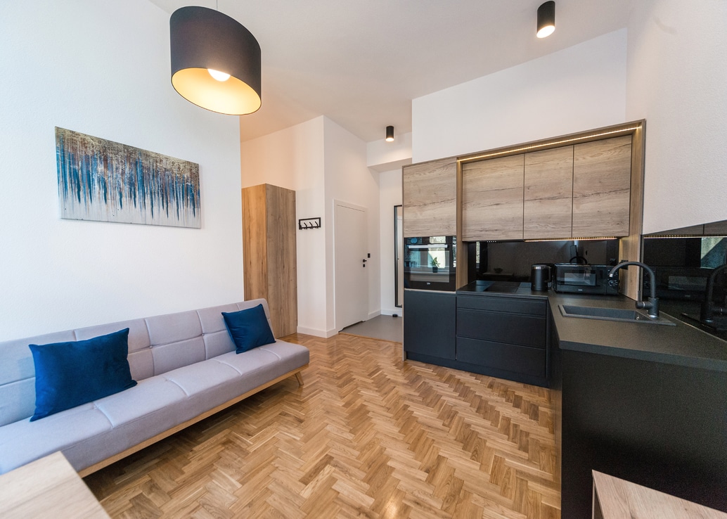 Luksusowe i nowoczesne studio w samym sercu Bielska-Białej. Do Państwa dyspozycji jest salon połączony z przedpokojem i aneksem kuchennym, część sypialna z podwójnym łóżkiem i szafą oraz łazienka. Kuchnia jest w pełni wyposażona. Dużym atutem wnętrza jest jasne okno wychodzące na podwórze, które wraz z nadejściem wiosny wypełnia się zielenią i śpiewem ptaków.