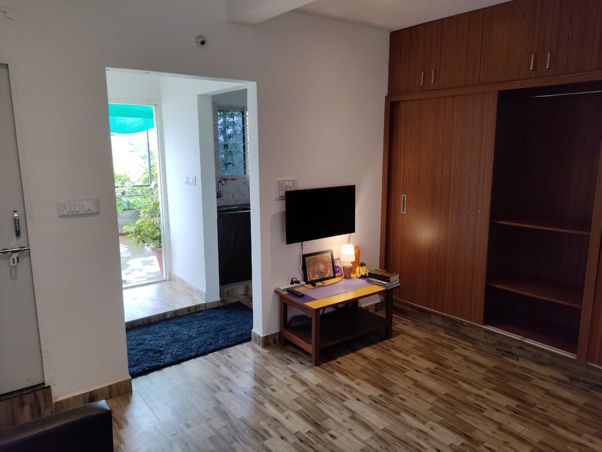 Mud & Mango is a cozy 200 sqft garden studio just 15 minutes from airport. This tiny home has earthy handcrafted interiors with unique tile work and opens into a small private garden with a young mango tree. Being a corner property, you may hear passing vehicles and the nearby playschool (8 am–2 pm). As the evening sets in the place slowly transforms into a calm and beautiful setting, truly charming. I live within the larger property, separated by a thick plant boundary, happy to help if needed.