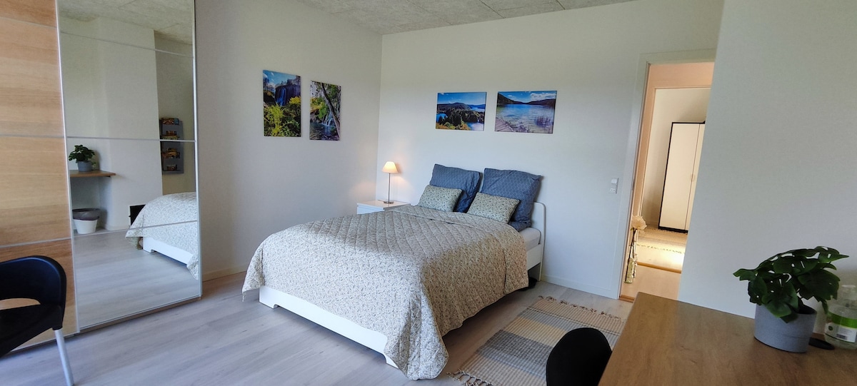 Thuê căn hộ của chúng tôi nằm trong môi trường xung quanh đáng yêu và yên tĩnh. Căn hộ hoàn toàn hẻo lánh và bạn có lối vào riêng của mình. Căn hộ có: 1 giường đôi, 1 giường tầng. Có thể có ga trải giường trên sofa giường cho 2 người. TV. Wifi. Chỉ cách Legoland 29 km, cách sân bay Billund 29 phút và cách trung tâm thành phố Kolding 10 phút, nó nằm ở trung tâm. Phong cảnh đẹp ở cửa nhà bạn. Các tuyến đường xe đạp đáng yêu cũng như hồ câu cá ở khoảng cách gần. Mua sắm 800 mét. Rất mong được chào đón bạn