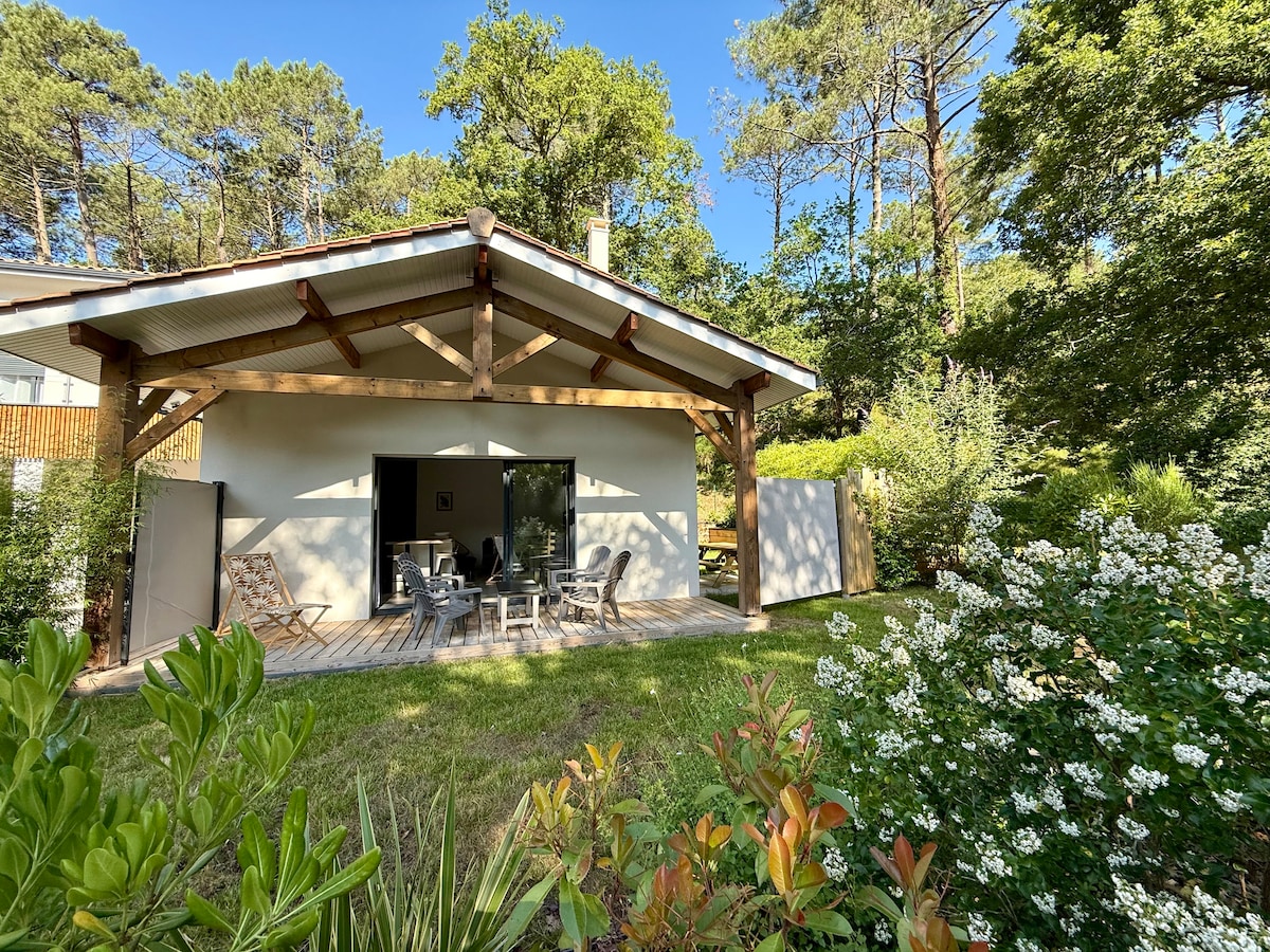 Studio/chalet récent de 26 m² avec patio de 15 m2 à Biscarrosse bourg à 15mn en voiture de l'océan et du Lac. Dépendance mitoyenne à ma maison dans rue très calme à 2 mn du centre - Entrée autonome/portail/jardinets indépendants - Chambre avec lit 140 + salle d'eau + wc. Draps et serviettes fournis. Cuisine équipée. Ravissant patio avec table, chaises, transats, parasol. Animaux acceptés.