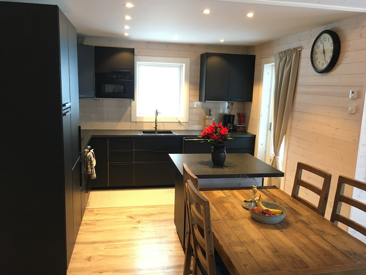 Ferdig oppreide senger og gratis sluttrengjøring. 96 m2 stort hus med stor terrasse, grill og nydelig utsikt. Terrassemøbler. 3 soverom. Fantastiske solforhold. Ligger på gård i drift med melkeproduksjon. Parkering rett utenfor dør. Rullestolrampe, alt på et plan. Muligheter for å se både nordlys, elg og rådyr fra terrassen. Smart-Tv og internett inkl.,Sprinkelseng og stellebord. Nært skog, turmuligheter og skiløyper. Laksefiske og småviltjakt i nærheten. Egen ladekabel bil må medbringes.