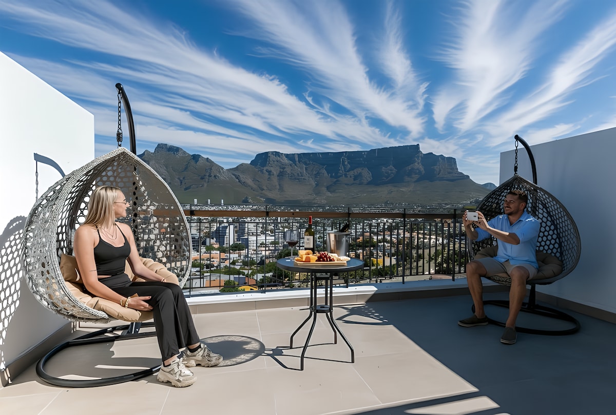 Tận hưởng tầm nhìn quang cảnh núi bàn trong một nơi ẩn náu trên mái nhà hiện đại