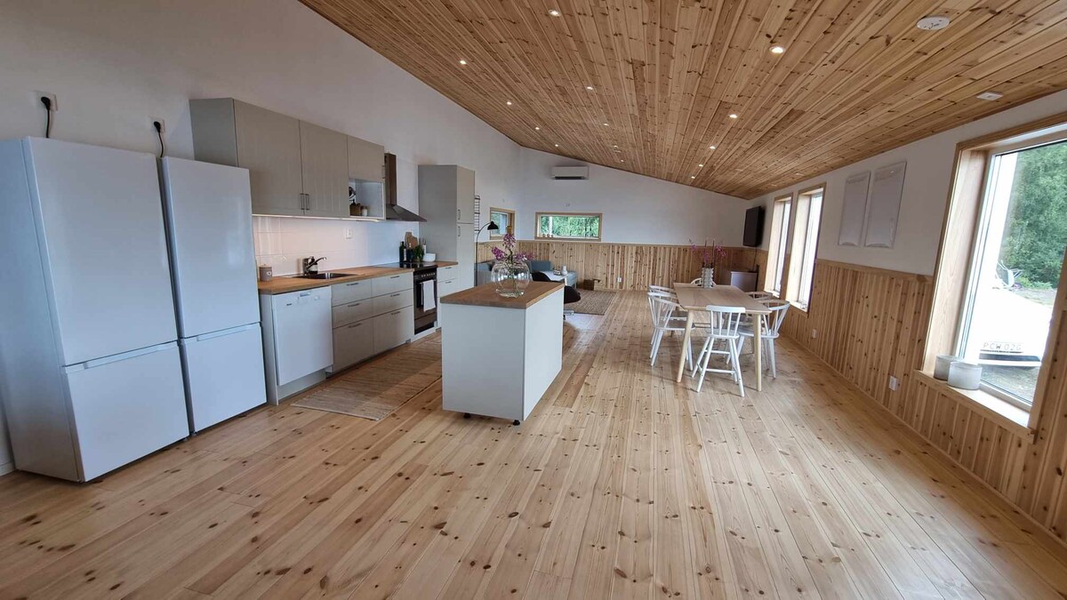 This is a comfortable modern house in the nature overlooking a beautiful calm river Luleälv. Panorama windows, large terrace with views and lots of light. Calm beautiful area less than 1 hour from higher mountains and 10 minutes in car for shops. Very private perfect for nature excursions, kayak, skiing, cross country or slalom or just relaxing in the middle of the nature and enjoying wildlife and nature. It´s a dream from children and safe, also perfect for well behaved dogs.