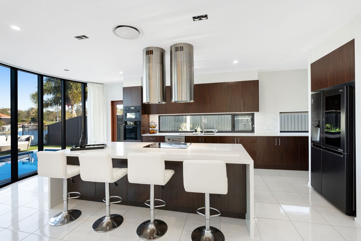 Bạn có thể tận hưởng một ngôi nhà sang trọng, nằm ở trung tâm trên một con kênh, gần các bãi biển của Đảo Bribie. Có hai phòng ngủ chính có phòng tắm khép kín cộng với hai phòng ngủ khác và một phòng làm việc có sofa giường. Phòng ngủ trên lầu của bạn có giường cỡ king với tầm nhìn tuyệt vời và ban công riêng để tận hưởng hoàng hôn tuyệt vời trên kênh đào. Bạn sẽ hài lòng với nhà bếp và phòng đựng thức ăn dành cho quản gia được trang bị đầy đủ tiện nghi. Gia đình bạn sẽ thích phòng truyền thông thoải mái và TV 98" cùng hồ bơi spa và sân gôn.