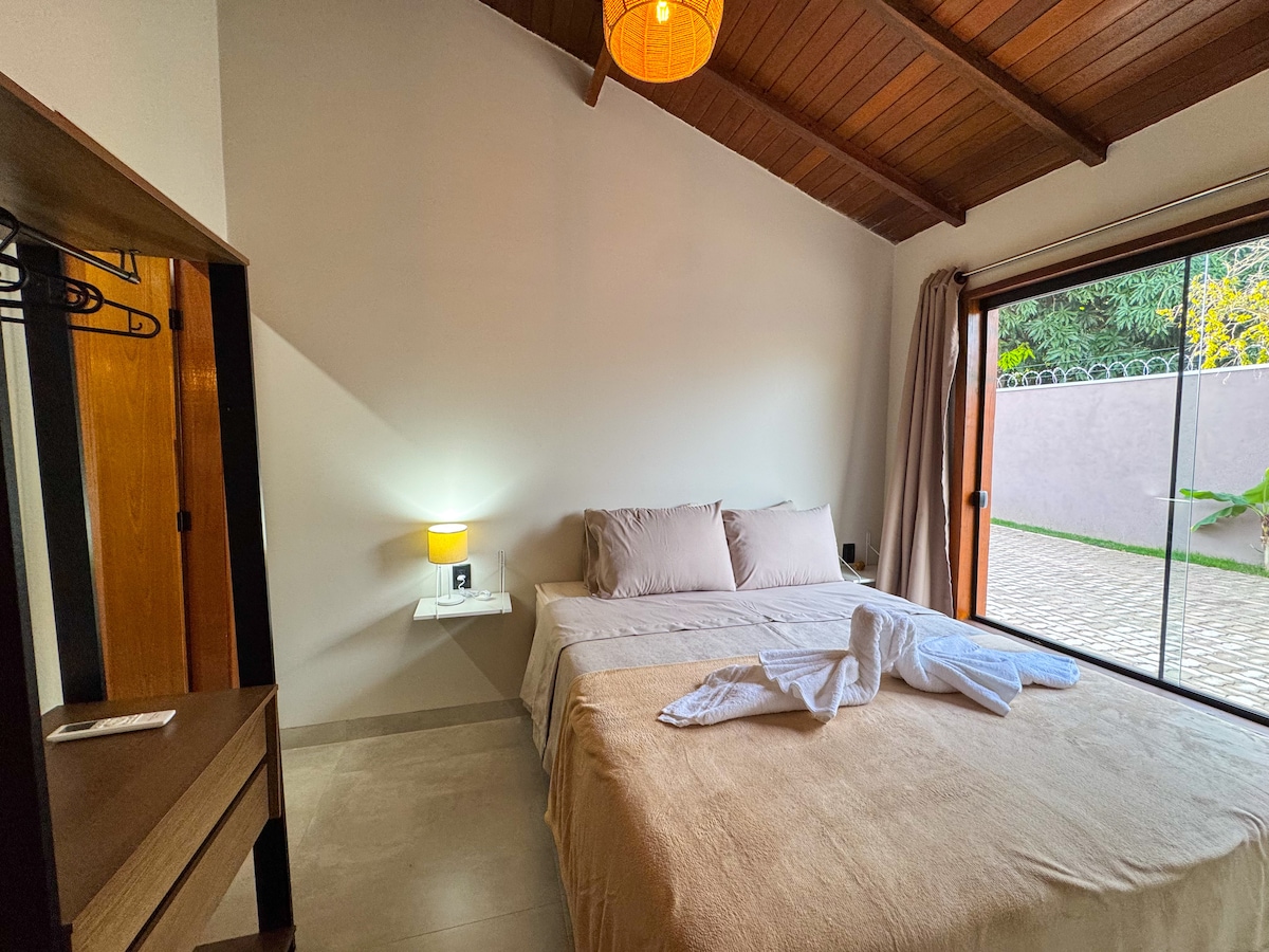 Casa em condomínio à 5 quadras do centro de Bonito. Além dos quartos com ar condicionado, possui um banheiro e uma sala-cozinha com sofá-cama, mesa, TV e ventiladores de teto. A cozinha possui fogão, geladeira, microondas, forninho elétrico, cafeteira e demais utensílios. Dispõe de Wi-Fi, opção de rede de deitar junto a entrada da casa, além de vaga de garagem. Possui ainda lavanderia com tanque e máquina de lavar roupas, junto a quintal privativo com churrasqueira portátil e bancos ao ar livre.