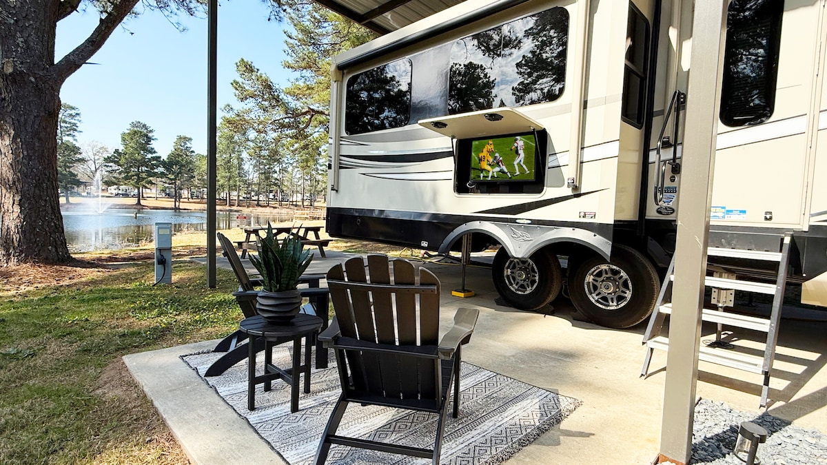 Experience modern luxury in this incredible Jayco Pinnacle RV for your perfect getaway at Forest Lake RV Park. Enjoy stunning surroundings with a 5-acre catch-and-release lake, walking trails, and a refreshing swimming pool. Inside, unwind in a spacious living area featuring plush seating and a large flat-screen TV. Meal prep is a breeze with state-of-the-art kitchen appliances. When it’s time to relax, retreat to the serene queen-size bedroom for ultimate comfort.