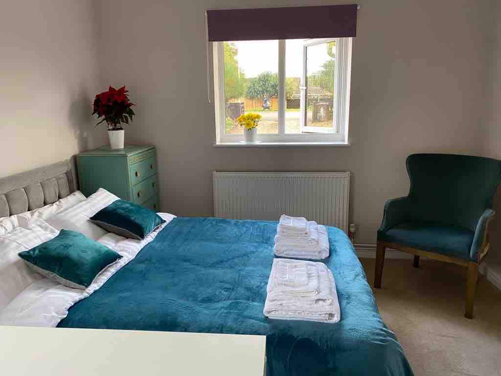 Converted rustic barn adjacent to main house. Access over gravel driveway. Private building with shared garden. Light and airy with French windows and roof lights. Exposed original beams. 2 rooms plus ensuite shower/loo. Please specify super kingsize OR twin beds when booking. Situated in a quiet village with easy access to Bury St Edmunds, Newmarket, Cambridge, Norwich and coast. Friendly hosts, chickens, dog and cats on property and fresh eggs supplied. Swallow barn is a writer’s paradise!