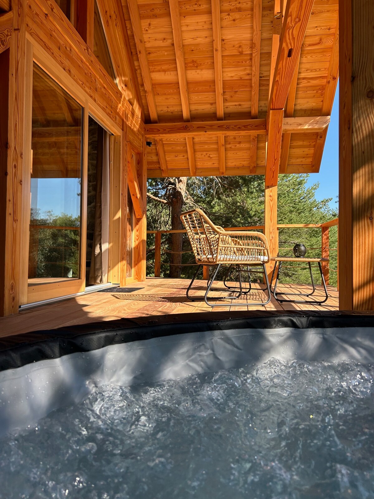Chalet insolite sur pilotis avec spa privatif sur la terrasse (accessible toute l'année) au coeur d'un domaine en pleine nature, au milieu des pins. Au bord du lac de Serre-Poncon, à 30 min de la station de ski de Réallon et 45 min de la station des Orres. Salle de bain avec grande douche à l'italienne, wc séparés. Poêle à granules pour réchauffer vos soirées d'hiver. Petit déjeuner compris. Lit fait à l'arrivée, peignoir et serviettes fournis.