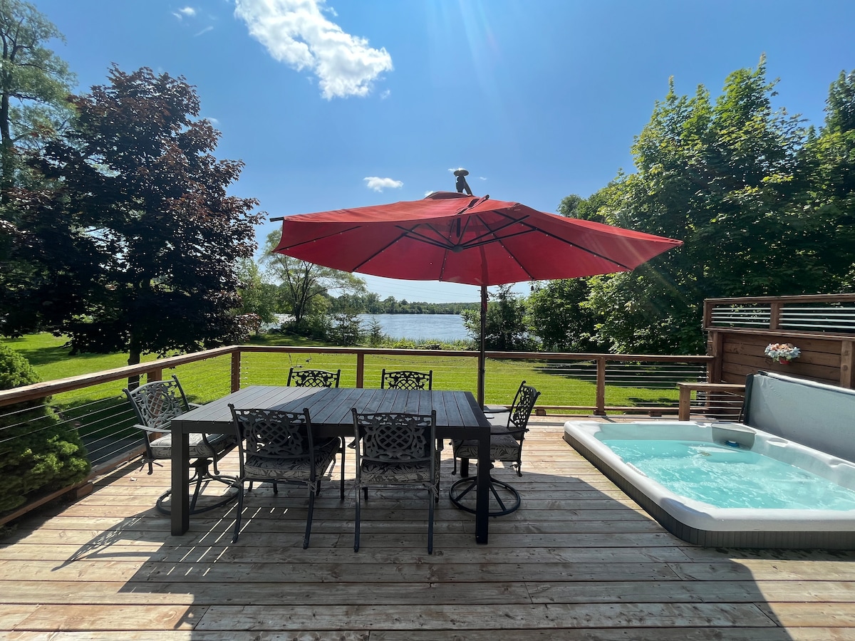 Enjoy panoramic views of Lower Buckhorn Lake with the family! Relax perched in the hot tub atop the rocks of the Canadian Shield, nestled among the tall pines. This newly updated waterfront cottage features 3 bedrooms & an open concept living space. Over 280 feet of waterfront for you to enjoy the sunrise & sunsets & fish off the dock! Get cozy on the couch, play games, or watch movies. Take a stroll around the island. Hi speed Wi-fi to work or play. 6 minutes to town, less than 2 hrs from GTA.