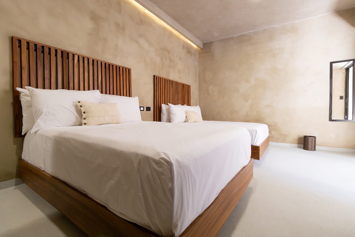 La habitación doble está en planta baja, ofrece un espacio cómodo, fresco y tranquilo, ideal para descansar o trabajar remoto. Su diseño boho-tropical, crea una atmósfera relajante perfecta para una estancia agradable. Cuenta con 2 camas queen size, A/C, ventilador, TV, WiFi, baño privado, frigobar, cafetera Nespresso y barra de cocina. Como huésped podrás disfrutar de las áreas comunes como la alberca, salón de coworking, sala de estar, cocina equipada y circuito de vigilancia.
