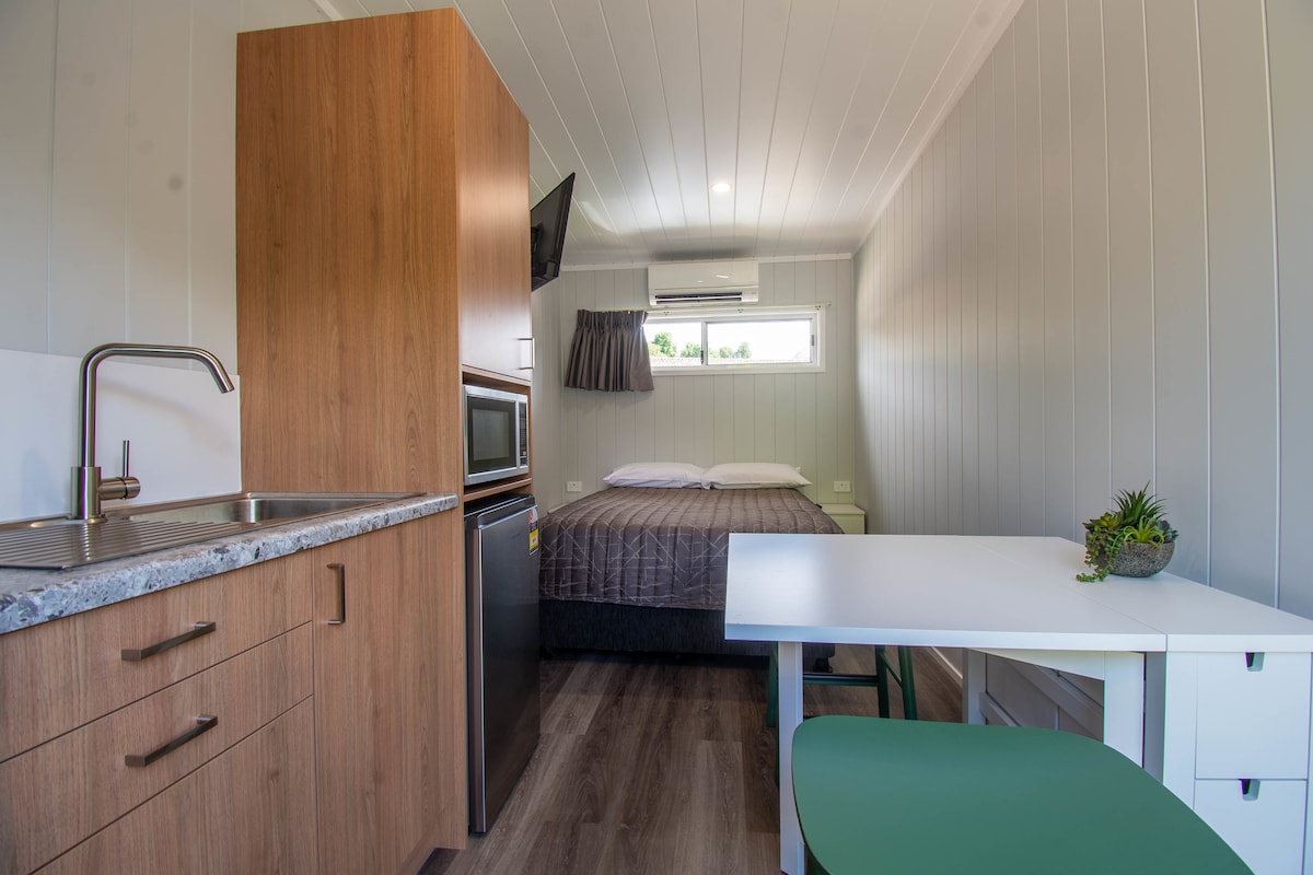 Looking for a somewhere to escape to thats filled with luxury and class? This tinyhome comes with a stunning kitchenette, a king bed to die for with pure linen sheets, a smart TV & all the comforts needed to relax and unwind. The gorgeous bathroom has everything! Underfloor heating, a round bath for you to soak in, two waterfall shower heads and robes! Relax outside on the deck or the bbq area with the fire pit with the sunset. Secured parking at your doorstep. It’s our little slice of heaven!
