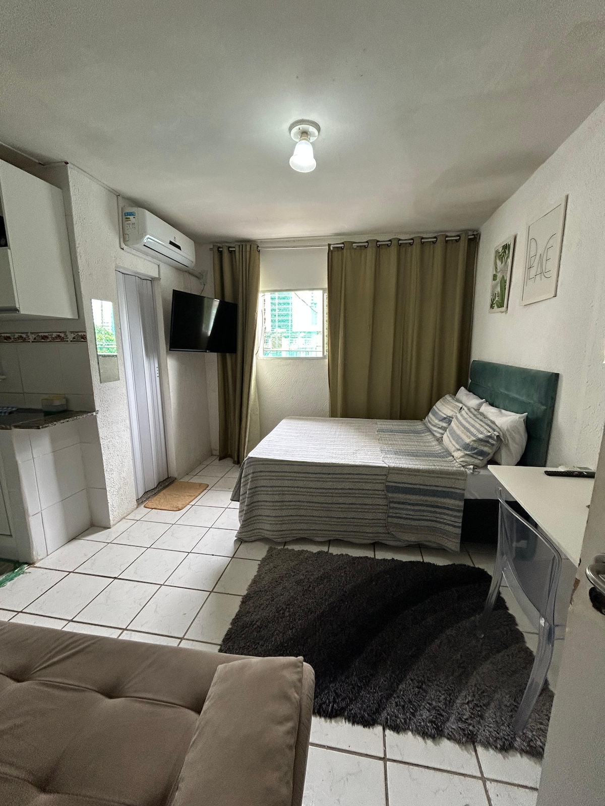 O Flat está em uma excelente localização, em um dos bairros mais nobres de Recife, Pina, à metros do Shopping Rio Mar, cofre,quarto e sala, com cama de casal e sofá-cama na sala, fogão com forno, microondas, 2 ar condicionados (Split), 2 Tvs, wifi 100M, armário, espelho, mesa de jantar e de trabalho, utensílios e eletrônicos de cozinha, panelas etc, secador de cabelo, peças de cama e banho. Mobiliado, vaga de garagem, academia, restaurante, piscina, sauna e rooftop. Lindíssima vista do Recife.