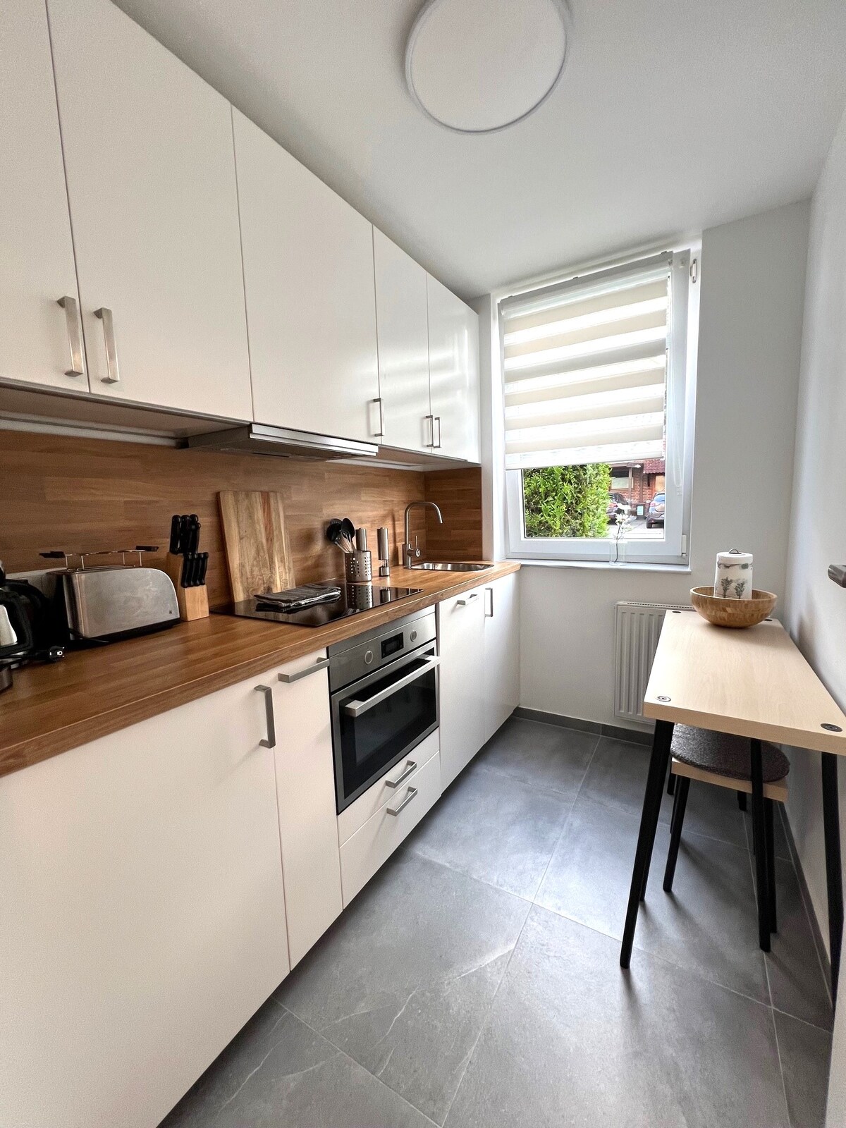 Căn hộ bao gồm một khu vực phòng khách / bếp kết hợp, một phòng ngủ, cũng như một phòng tắm nhỏ. Lối vào căn hộ riêng biệt là thông qua sân thượng, cũng có thể sử dụng được. Căn hộ có thể ở được các cặp đôi hoặc một gia đình nhỏ. Theo yêu cầu, có thể bố trí giường cũi du lịch cho em bé. Với thời gian lưu trú dài hơn, bạn có thể sắp xếp việc sử dụng máy giặt.