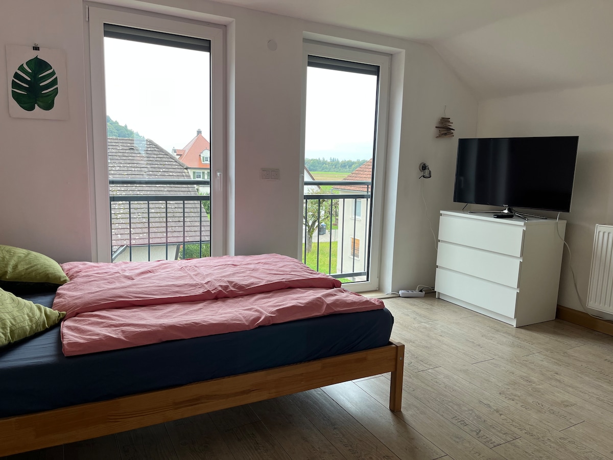 A quiet ground-floor apartment in a large detached house with seperate entrance and private parking. A large studio with double-bed , sofa , armchairs, TV , WIFI, a selection of DVDs and books plus a small work-table. Seperate kitchen and bathroom. A high-chair and baby-bed are available on request. An Italian restaurant , bakery, pharmacy and supermarket are within walking distance. A men's bicycle is available to rent. Local bus service to Biberach (Line 2)