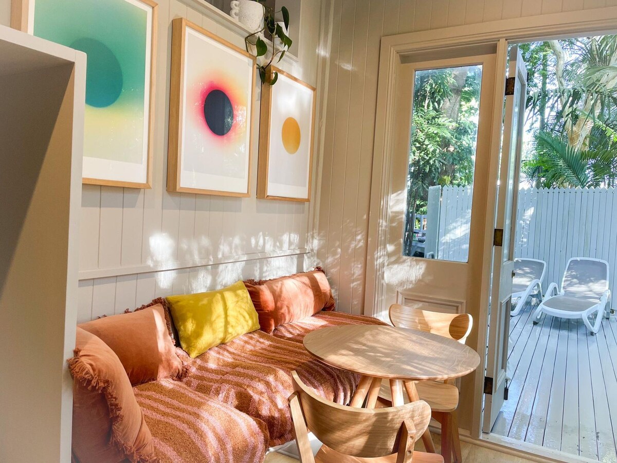 Nằm trên một con phố ngoại ô yên tĩnh ở Sunrise - cách Vịnh Byron 5 phút lái xe ngắn. Hoàn toàn mới và chất lượng được xây dựng, studio có lối vào riêng với vườn cảnh quan, vòi sen ngoài trời và sân hiên bí mật. Đối với tối đa 2 khách, không gian studio khép kín có giường queen, bếp (lò nướng, bếp và nhiều không gian tủ), phòng tắm riêng (có vòi hoa sen, nhà vệ sinh, bàn trang điểm và giặt ủi). Sàn gỗ đẹp, cả quạt trần và điều hòa đều hoàn thành không gian đáng yêu này.