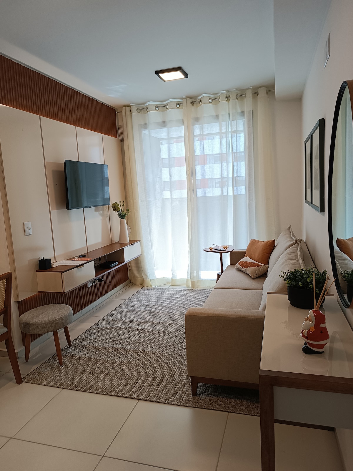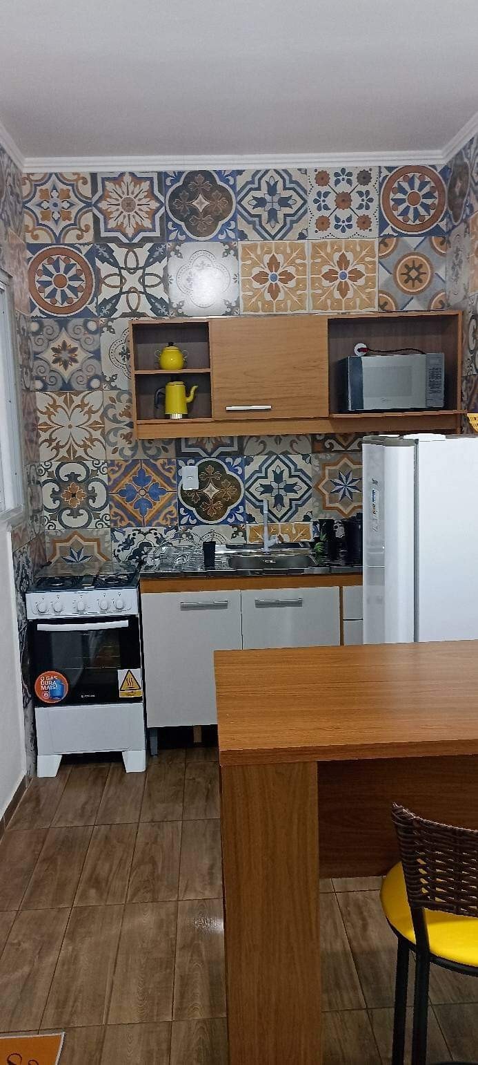 1 Dorm. 1 cama de casal, e um sofá cama confortavel acomoda até 5 P da família. Dispõe de cozinha sala tv Smart de 43 pol internet wi-fi garagem dentro do condomínio para carros pequenos, camionetas grandes não entram. Há câmeras de vigilância no condomínio e o Checking e checkout com cofre de Chaves. AP moderno e estiloso, bonito e aconchegante com ar condicionado e roupas de cama, toalhas e um pequeno café que podem se servir. Garagem (box 4) 2,40 lar x 2,13 alt x 5 comp.