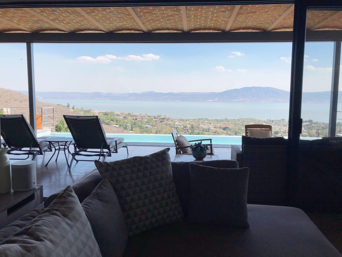 Vista Infinita A beautiful modern home with expansive southern views of Lake Chapala. The decor is contemporary Mexican. Great privacy between bedrooms, each with its own luxury bathroom. Large pantry and two car garage. Well equipped kitchen with gas cooktop. BBQ. Easy access, no stairs. 13 meter infinity pool & jacuzzi spa: heated! Gas fireplace. Screens through out with large smooth operating sliding doors. Luxury linens, spa like white fluffy towels. Artful and decorative!