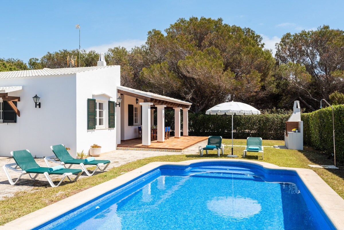 Trải nghiệm Menorca trong biệt thự hai tầng theo phong cách Menorca của chúng tôi với tầm nhìn ra biển, hồ bơi riêng và sân sau xanh mướt. Mới được cải tạo gần đây, chỗ ở này có sân cỏ rộng rãi và hoàn toàn riêng tư nhờ những bụi cây cao. Ngắm hoàng hôn ngoạn mục từ ban công trên tầng cao nhất. Cách nhà hàng, siêu thị một quãng đi bộ ngắn và cách bãi biển Son Xoriguer và cảng Cala en Bosch vài phút. Nằm trong một khu phố yên bình với chỗ đỗ xe miễn phí trên đường phố, hoàn hảo để thư giãn và khám phá.