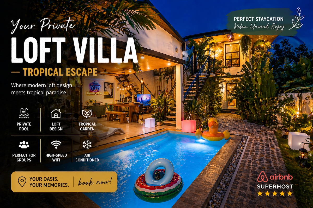 Chào mừng bạn đến với biệt thự khung hình chữ A kiểu Bắc Âu! 🏡 Nghỉ ngơi tại biệt thự khung chữ A thuận tiện nằm ở biên giới của Tagaytay và Silang. Tỉnh dậy với khung cảnh tuyệt đẹp, với khu vườn xứng đáng với IG và trang trí nội thất thanh lịch chắc chắn sẽ gây ấn tượng. Đắm mình trong các tiện nghi sang trọng như hồ bơi riêng và bể sục, hoàn hảo cho các gia đình và các nhóm. Hồ bơi nước nóng và bể sục có sẵn với phụ phí. Wi-Fi được cung cấp bởi Internet tốc độ cao Starlink.