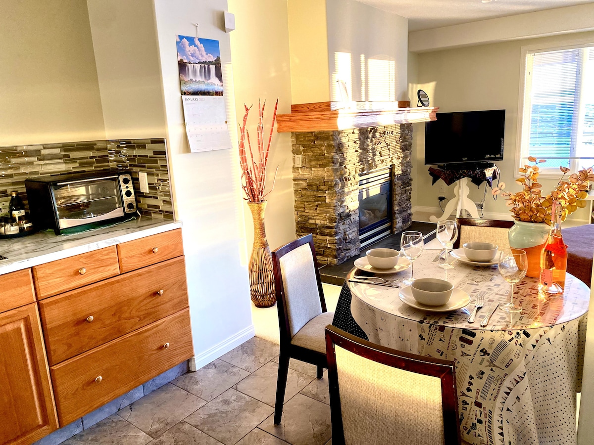 This colourful and cosy suite has free parking and a private entrance. It is bright and comfortable with two queen size beds, black-out blinds, living room with fireplace and big TV, full bathroom, full kitchen, washer and dryer, heating and A/C. Bathrobes, slippers, toiletries and basic cooking supplies are provided, plus Netflix and Disney+. Please let me know if you are bringing a dog as there is a $30 fee. LGBTQI2SA+ friendly.