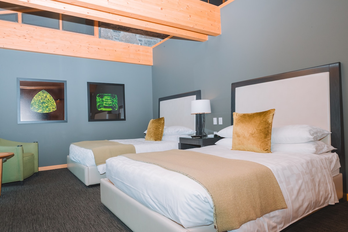 The Hematite Premium Suite allows you to spread out or entertain in a generous living area, with a pillow-soft sofa bed, two lounge chairs, 40" Apple TV, wet bar, water closet and executive work station. A separate bedroom features two queen beds, 32" TV, patio with its own stunning view, spacious ensuite with luxurious freestanding soaker tubs, separate stand-up shower, double vanities and heated slate floors.