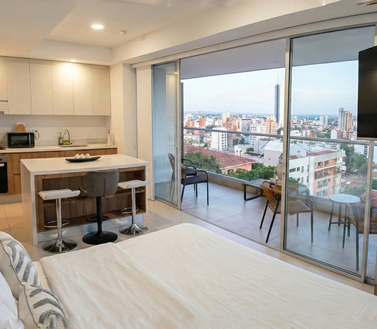 Studio penthouse sang trọng ở quận Granada sôi động của Cali với tầm nhìn ra thành phố tuyệt đẹp. Lý tưởng cho khách đi một mình hoặc các cặp đôi. Ngủ tối đa 3 người: giường queen, sofa giường cỡ trung bình (80x160 cm). Tận hưởng nhà bếp đầy đủ, giặt ủi trong căn hộ, sân thượng, cùng với quyền sử dụng hồ bơi, phòng tập thể dục, spa, không gian làm việc chung và phòng họp. Nâng cao thời gian lưu trú của bạn với các lớp salsa, tour du lịch sinh thái, ngắm cá voi và các đầu bếp riêng, tài xế và chuyên gia trị liệu mát-xa tùy chọn - tất cả được tuyển chọn riêng cho bạn. RNT: 251456