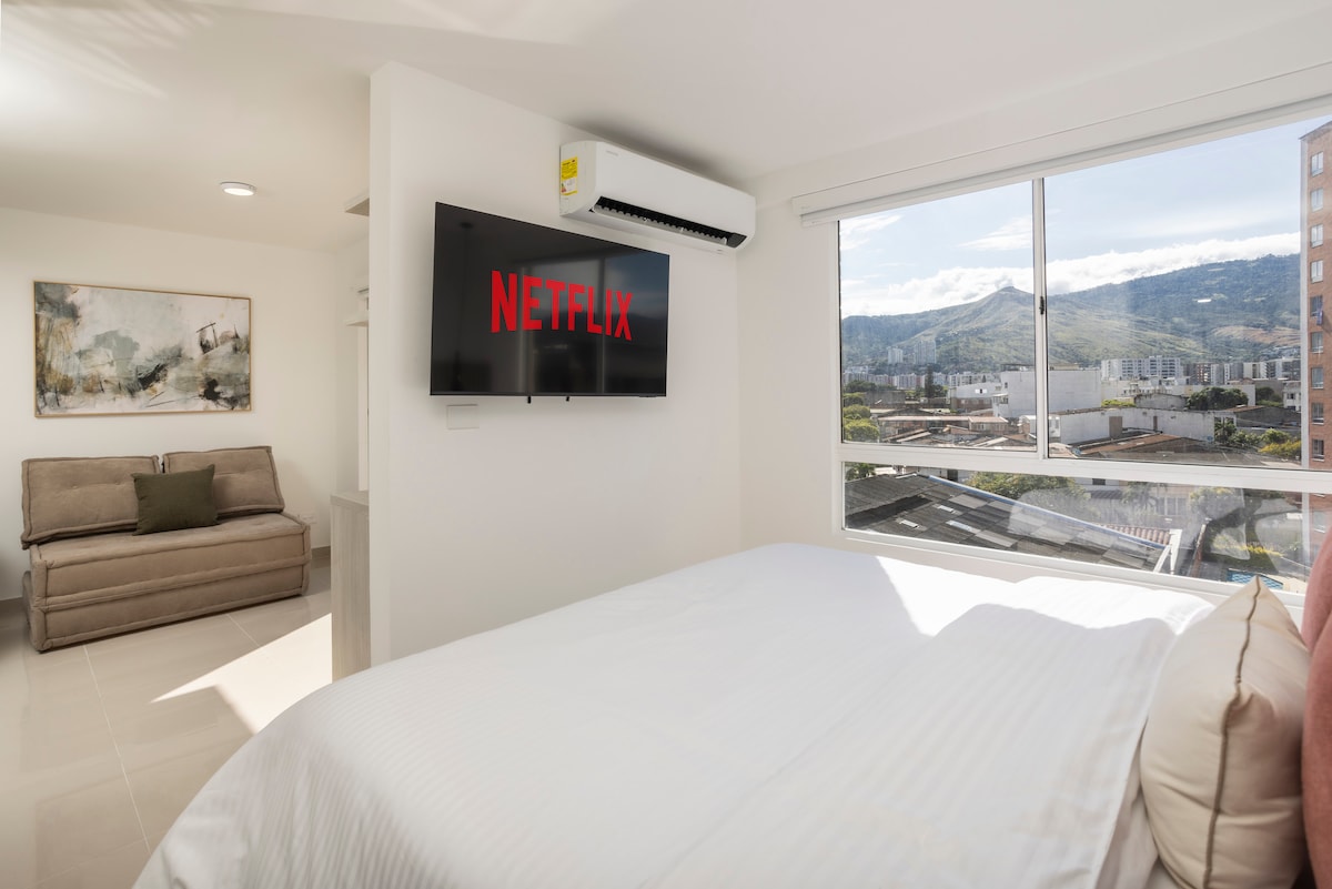 Disfruta de este moderno apartaestudio en el piso 10, con hermosa vista al norte de Cali. Ideal para parejas o viajeros, ofrece aire acondicionado, cocina equipada, Wi-Fi rápido, TV inteligente y parqueadero. Ubicado en zona segura, cerca de centros comerciales, supermercados y restaurantes. El edificio cuenta con piscina, gimnasio y vigilancia 24/7. Vive una estadía cómoda, privada y bien conectada.