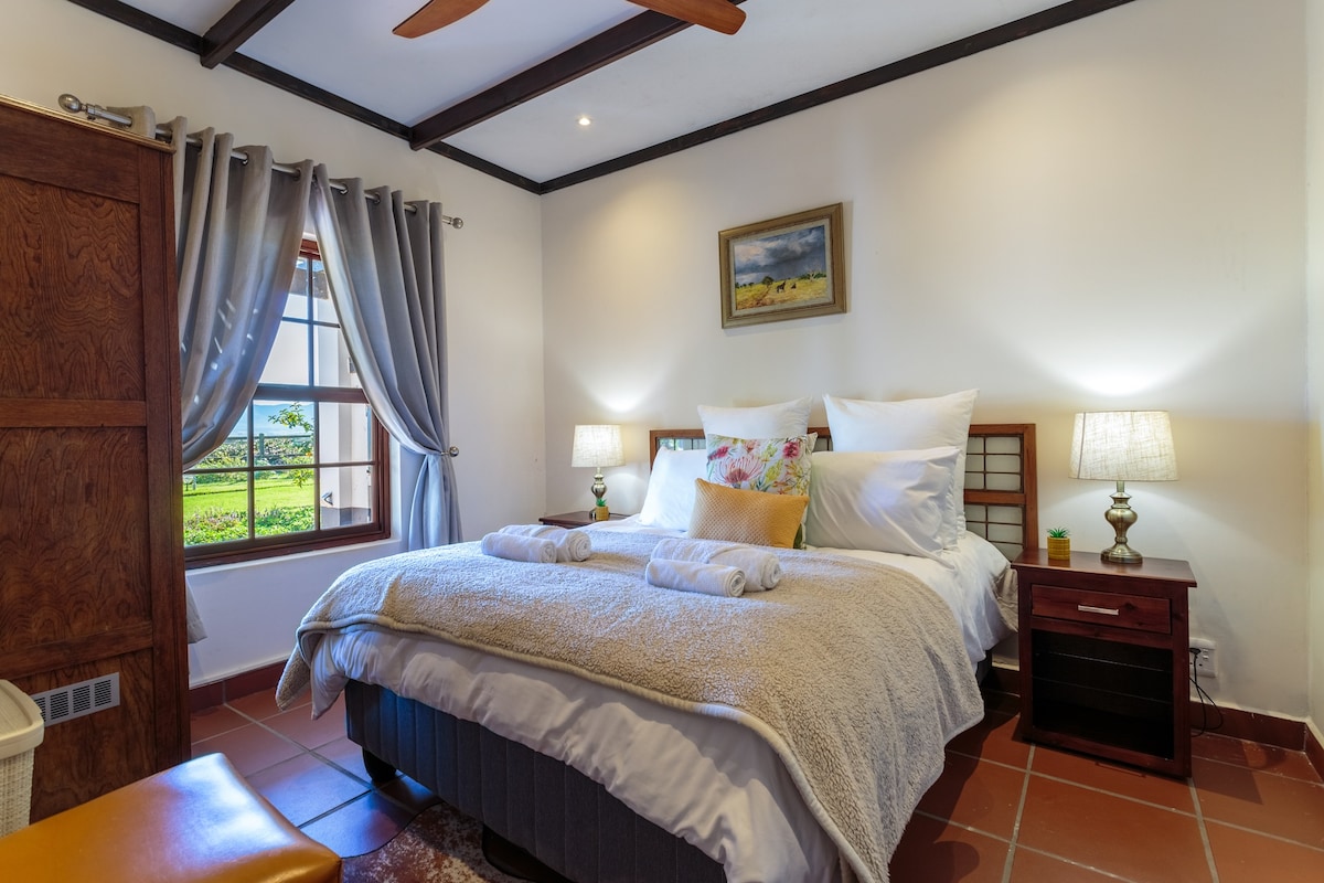 This private open-plan self catering farm cottage offers old-world charm with a stylish, minimalist touch. Designed for eco-conscious living, it runs on minimal electricity and features a fridge-freezer, water cooler, gas stove, and gas geyser. While there’s no TV, WiFi, or strong network coverage, it’s the perfect place to unwind and disconnect. With luxury linen and cozy details throughout, the cottage offers a peaceful, comfortable escape—your ideal home away from home on the farm.