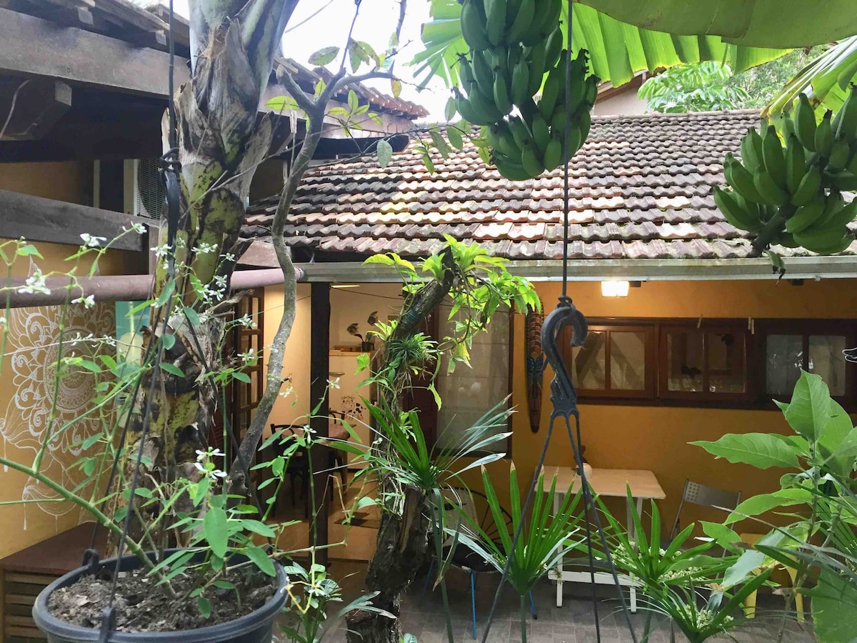 Que tal uma mini casa em meio ao verde para relaxar? A mini casa bananeira, com plantas, arvores e flores que atraem os passarinhos e beija flores, com sorte é possível receber a visita de tucanos e aracuãs. Um espaço para quem gosta de natureza ao redor. Entrada privativa, ar condicionado frio, cama de casal, ideal para 3 pessoas . Cozinha equipada com os itens basicos e banheiro privativo. Estacionamento. Bem localizado, proximo de padaria, mercado e farmácia.