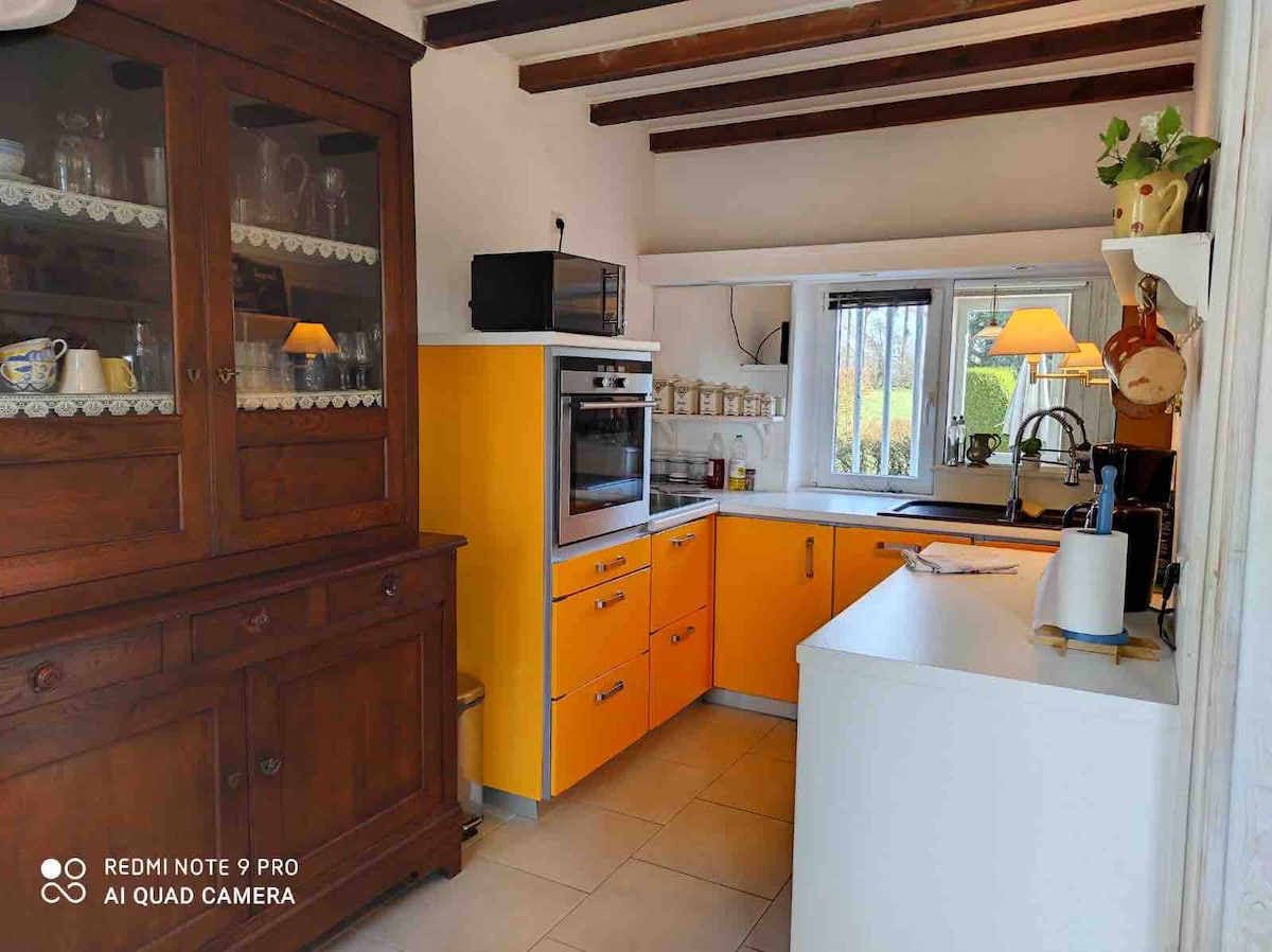 Ngôi nhà gần bãi biển đổ bộ, trong sự yên tĩnh của vùng nông thôn Normandy. Nhà của chúng tôi có sức chứa tối đa 5 người, bao gồm một phòng khách đôi được trang bị giường sofa, khu vực sinh hoạt có TV, phòng tắm có nhà vệ sinh, phòng tắm có nhà vệ sinh, nhà bếp đầy đủ tiện nghi. Phòng ăn Phòng giặt ỦI: máy giặt, bàn là và cầu là. Tầng trên: một gác lửng có giường đơn và giường phụ. Một căn phòng có giường đôi. Khu vườn Wi-fi khép kín có gara khóa.