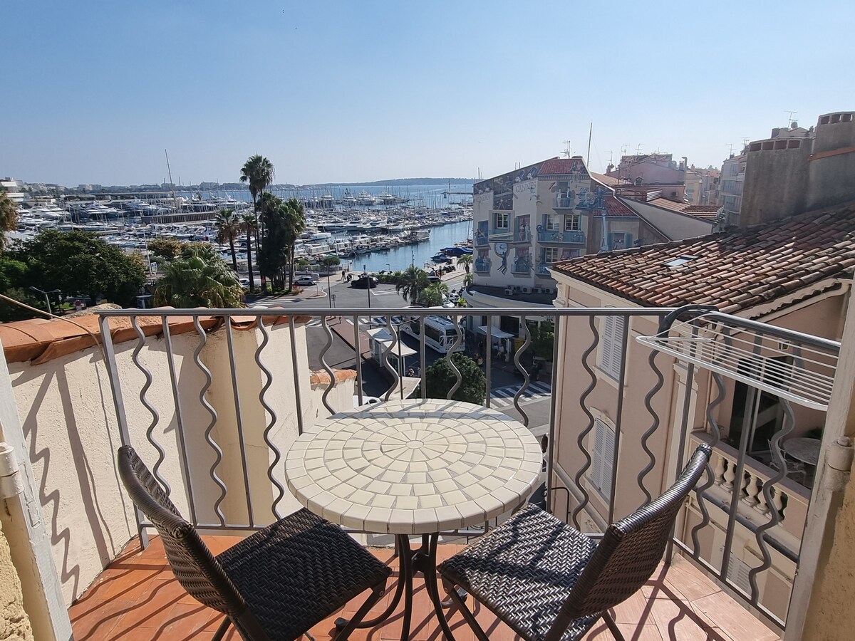 Luxury, light & airy studio with large & private panoramic SEA VIEW BALCONY overlooking the Old Port of Cannes & Palais. Free & very fast WIFI. New A/C. 50" SMART TV BEST LOCATION IN CENTRAL CANNES: only 5 MINS WALK TO PALAIS & La Croisette, 3 MINS WALK TO THE NEAREST BEACH. Restaurants & bars are on your doorstep. Car isn't necessary: bus stops & train station are 10 mins walk Newly refurbished apartment with build-in kitchen, washing machine PERFECT for holiday makers & business travellers