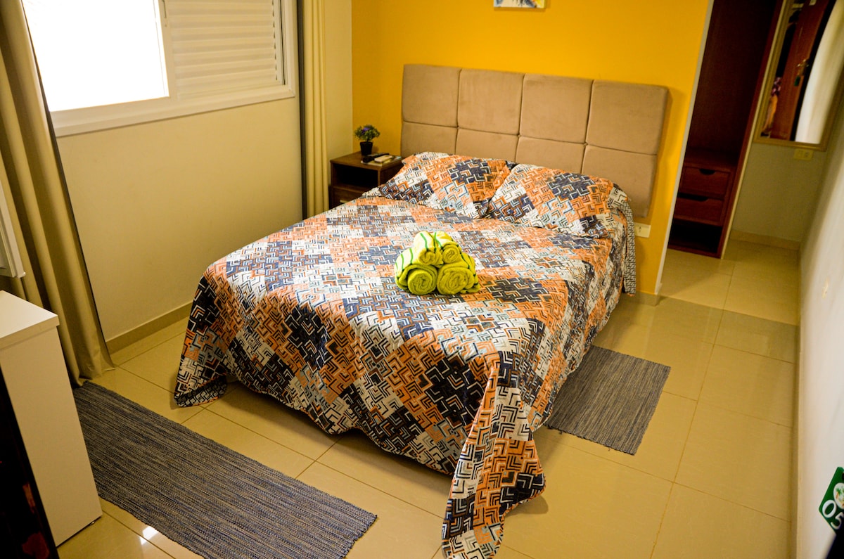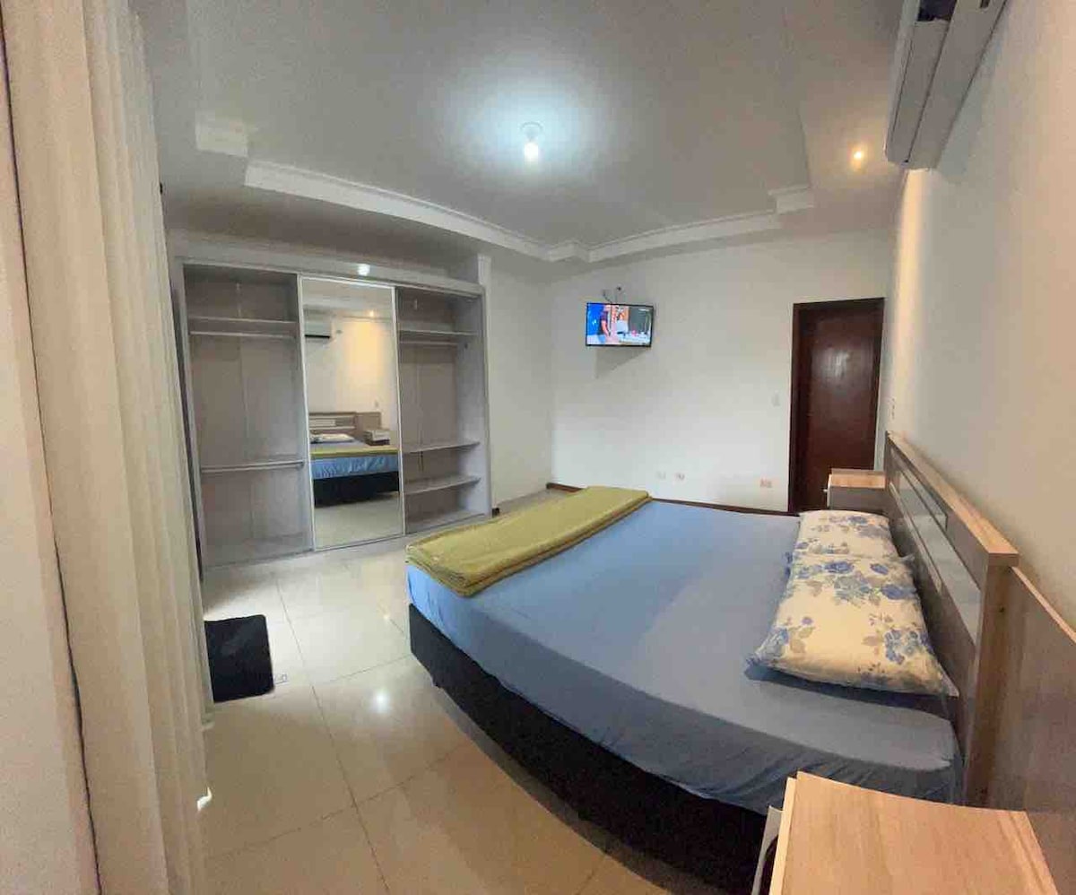 Suite Privativa. Área externa compartilhada. Suite projetada para oferecer conforto e praticidade. 👇🏻👇🏻👇🏻Características👇🏻👇🏻👇🏻 * Cama Queen * Banheiro Privativo * Ar-Condicionado 12.000 Btu/h Wind Free * Wi-Fi Gratuito. * TV 32 polegadas * Estacionamento disponível para seu veículo. * Acesso externo a uma cozinha compartilhada com outra suíte, equipada com todos os utensílios para preparar suas refeições.. * A suíte está localizada no primeiro andar, acessível por um lance de escada.