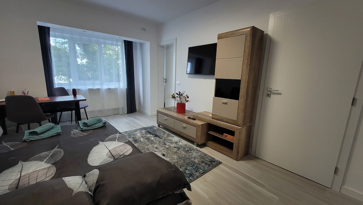 Studio được cải tạo của chúng tôi nằm trong khu vực Rovine của Craiova — một địa điểm yên tĩnh với lối đi nhanh đến trung tâm thành phố. Lý tưởng cho các chuyến công tác hoặc nghỉ ngơi tại thành phố. Chúc bạn vui vẻ: – Wifi nhanh – TV thông minh – Giường đôi ấm cúng – Nhà bếp trang bị tiện nghi – Phòng tắm hiện đại có buồng tắm đứng – Khăn tắm và đồ vệ sinh cá nhân Chỗ đỗ xe trên phố miễn phí gần đó. Gần các cửa hàng, nhà hàng và phương tiện giao thông công cộng. Rất mong được đón tiếp bạn!