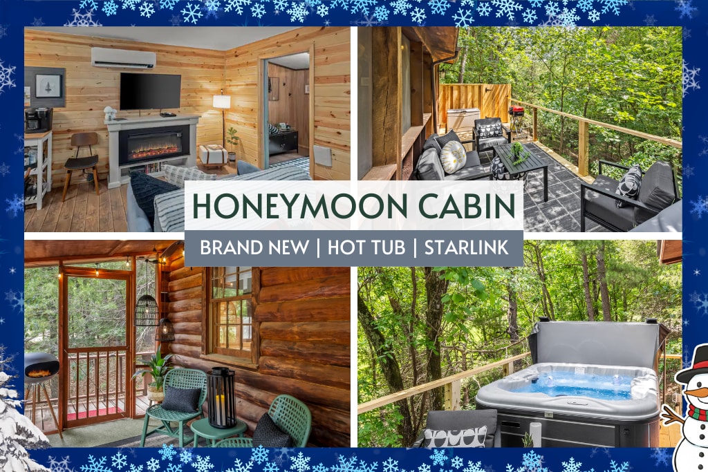 Hot Tub on Back Deck - No Cleaning Fee True Romance is here, experience stunning sunrise views from our most luxurious and spacious one-bedroom authentic log cabin nestled in a Pine tree grove. The cabin features: Cedar walls and vaulted ceilings Large bedroom with big windows and a king-size log bed perfect for stargazing. One full bathroom with a two-person jacuzzi hot tub, Living area with leather sofa, chair, and ottoman Open full kitchen and fireplace Screened deck equipped with hottub