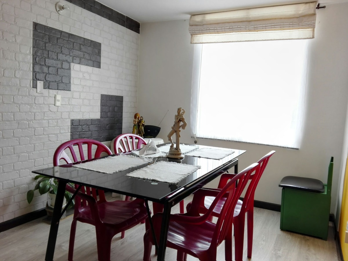 Tận hưởng căn hộ rộng rãi này, với sự sạch sẽ tuyệt vời và rất yên tĩnh, với bãi đỗ xe riêng, trung tâm cho phép bạn ở gần các nhà hàng và thương mại nói chung và với chất lỏng giao thông tốt. Hai dãy nhà từ trung tâm mua sắm Ciudadela el Chinca và gần con đường dẫn đến đầm Tota xinh đẹp, một nơi rất an toàn, yên tĩnh và thoải mái để nghỉ ngơi.