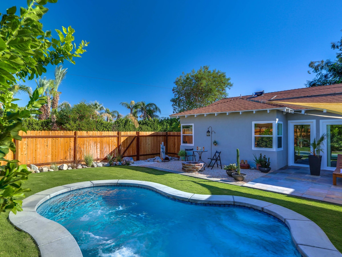 Beautiful inside and OUT. This charming Spanish-style home in the Desert Park Estates area of Palm Springs features 3 bedrooms, 2 bathrooms, a fireplace, and an open-concept kitchen with granite countertops in a serene desert surrounding. Our home is ideal for a quick getaway or an extended stay as a home away from home. Outdoor living at its best - featuring an oversized saltwater pool and spa, with a fire pit, and multiple seating areas. You will love this house!